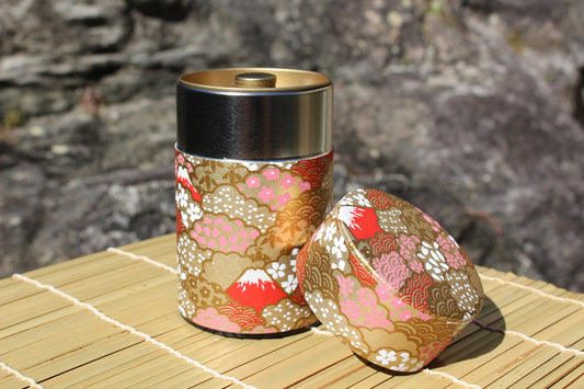Kotodo Japanese Washi Paper Wrapped Tea Tin Canister - Long 100g (3.5oz) Mt.Fuji & Golden Clouds (#132)
