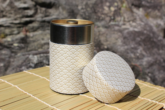 Kotodo Japanese Washi Paper Wrapped Tea Tin Canister - Long 100g (3.5oz) White Waves with Gold Outlines (#1)