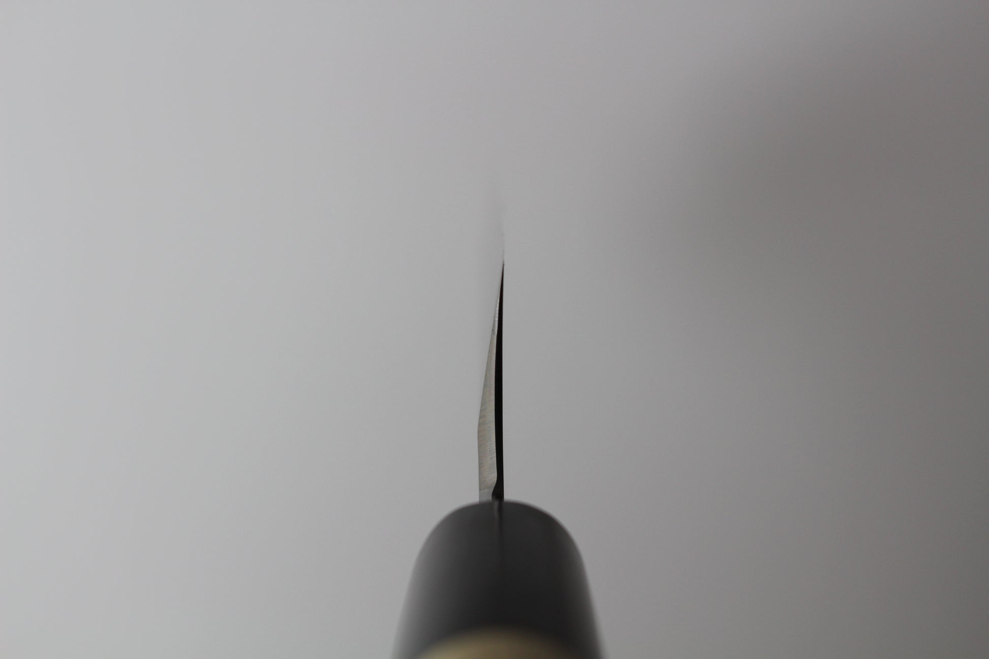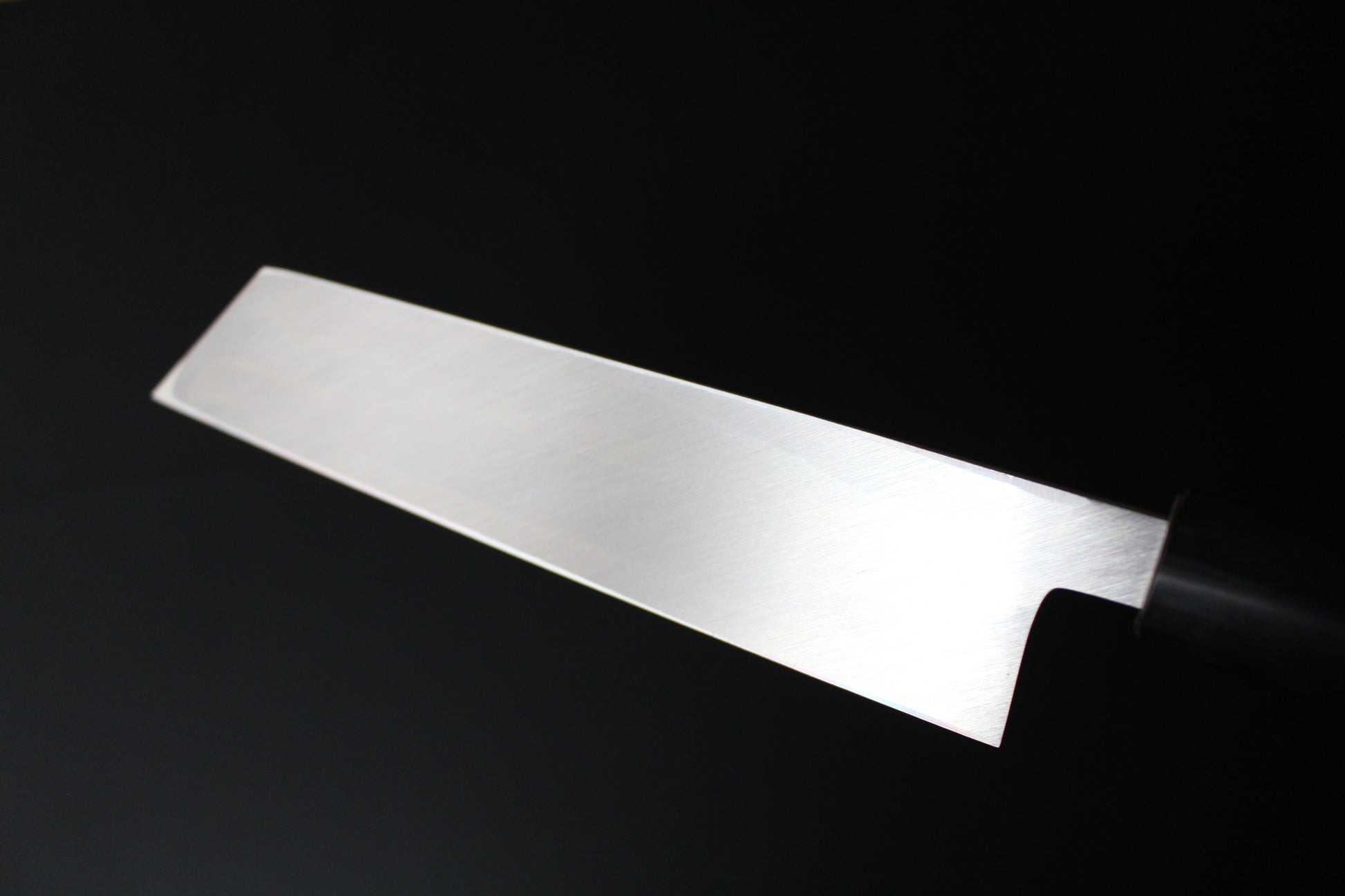 Kenmuki Knives are single bevel Japanese style knives for chopping and peeling vegetables. They are mainly used for "Katsuramuki," which is thinly peeling vegetables like Daikon white radish and carrots, to make "Tsuma," which is very fine julienned garnish for Sashimi. Kenmuki Knives are thinner than Usuba Knives and have a sharp pointy K tip.