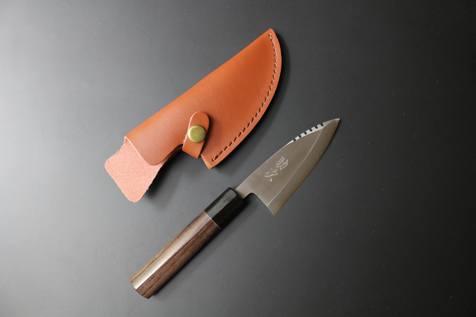 Deba Knife is a traditional Japanese single bevel Knife. It is popular used for filleting fish. This Ajikiri knife has a lighter, shorter and thinner blade than Deba knives. It is designed for filleting small fishes like mackerels. Since it has single bevel, there are different shape for right hander and left hander.