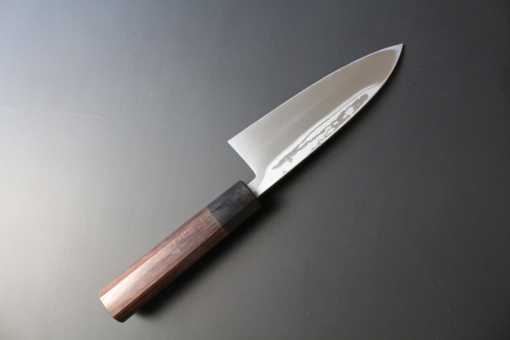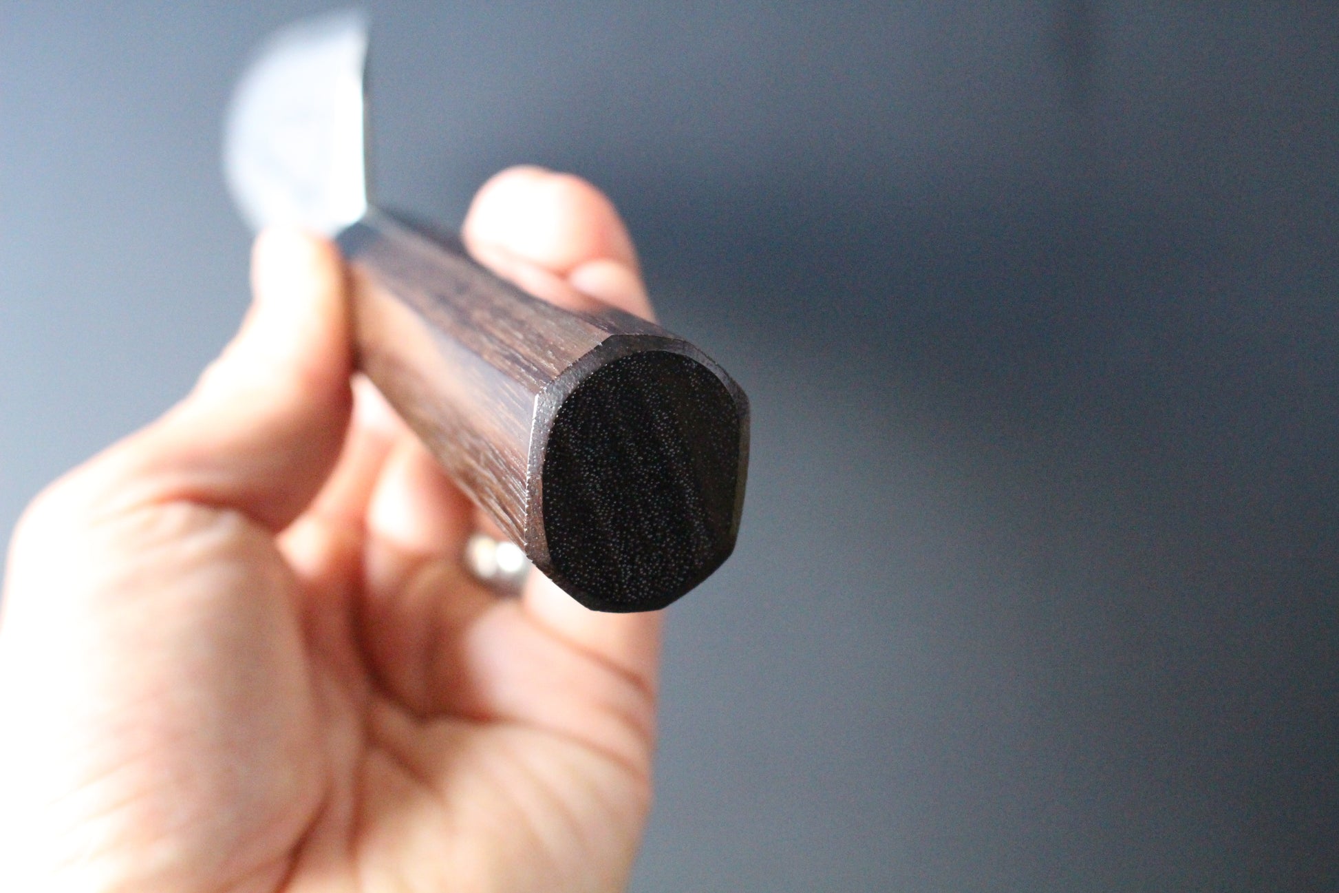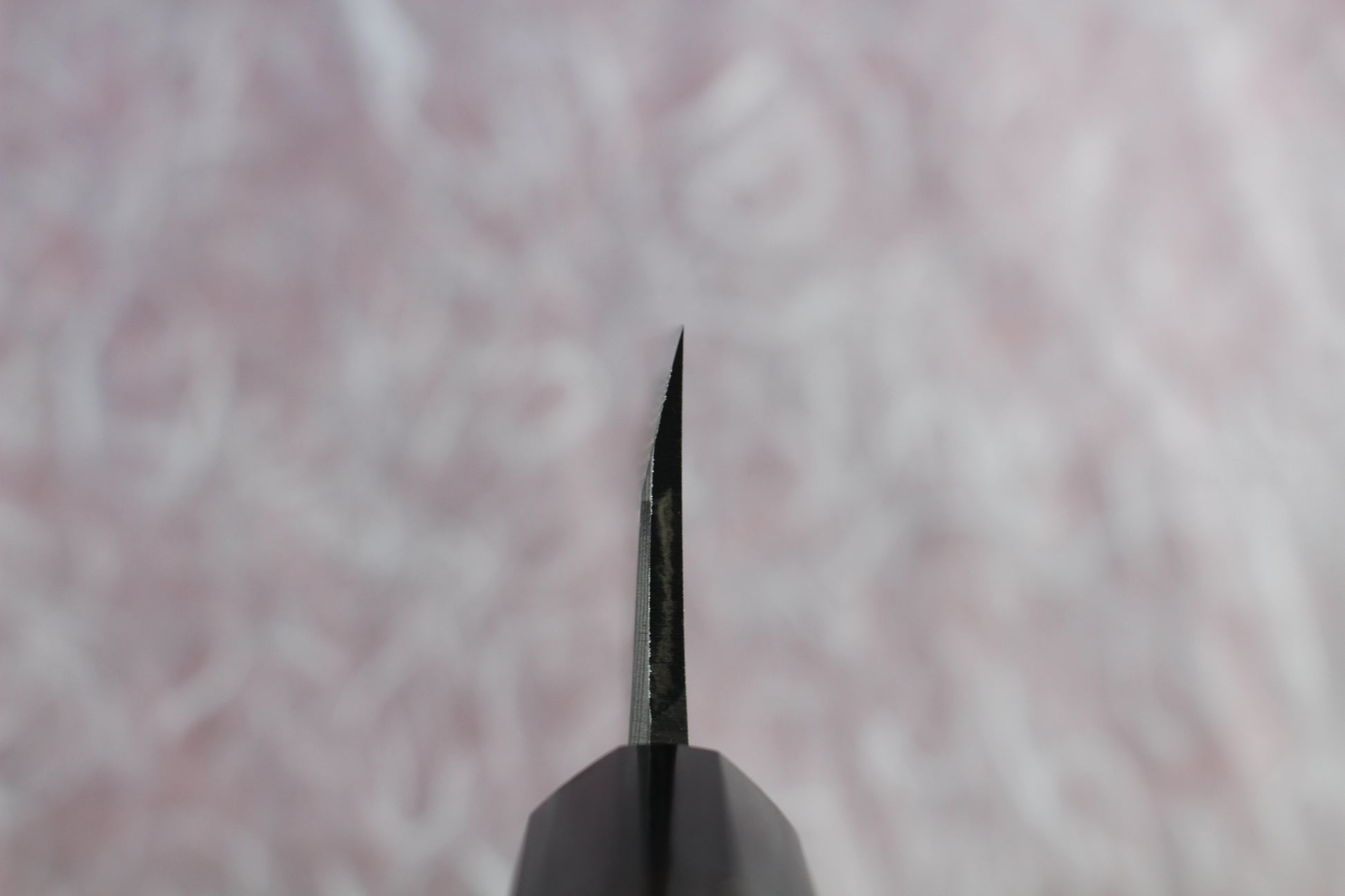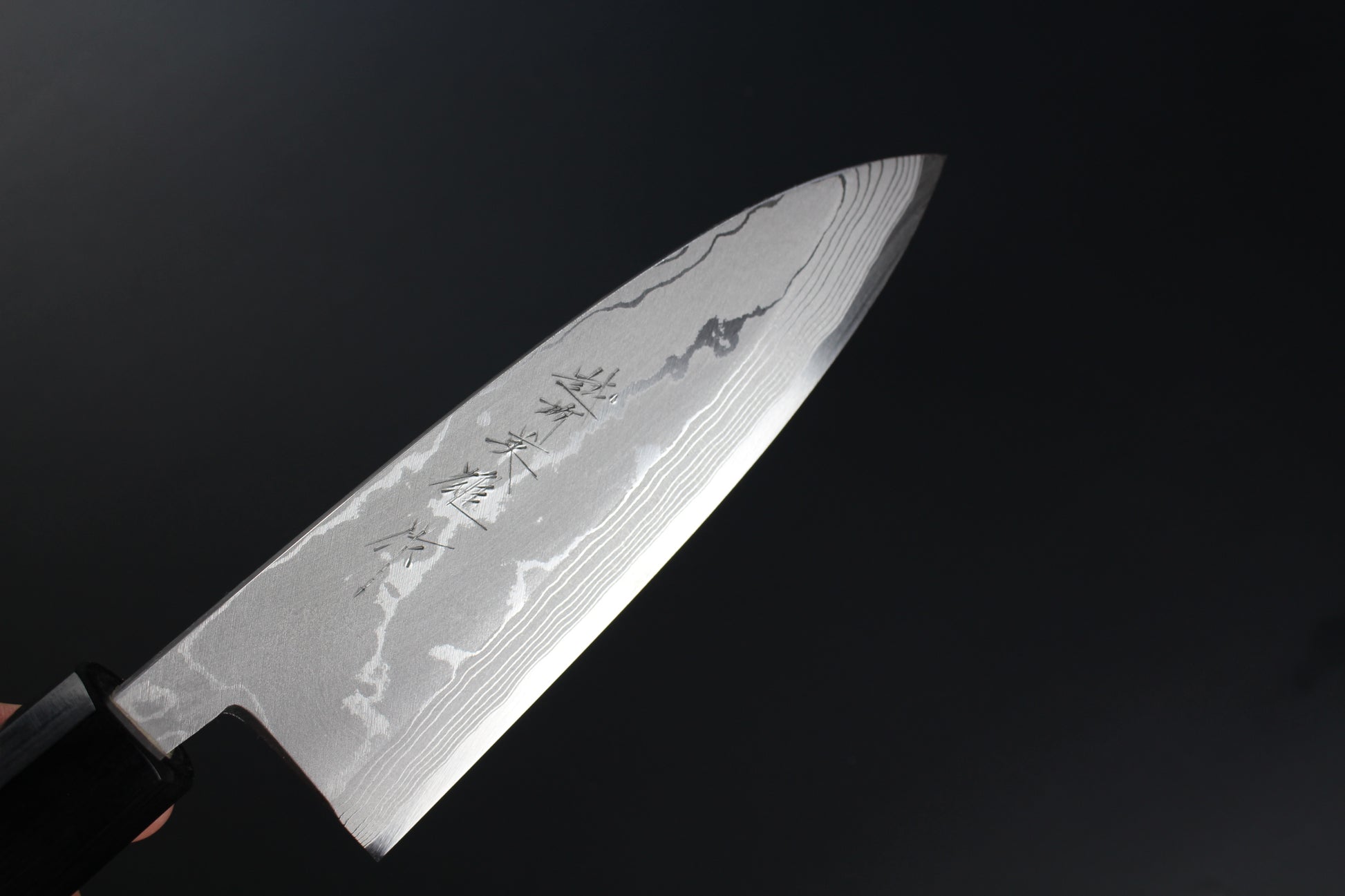 White Steel No.2 is a high carbon steel developed by Hitachi Special Stainless Steel. This steel is standard and most commonly used for Japanese style knives such as Sashimi and Deba knife for long time. White Steel No.2 gives a very sharp edge and has very good edge retention. It is also very easy to re-sharpen. It will rust if it is left wet or left in contact with something containing any amount of moisture, so need to wipe and dry completely after using. For longer storage protect with a film of oil to avoid lasting. Recommended for first time of Japanese style high carbon steel knife users.