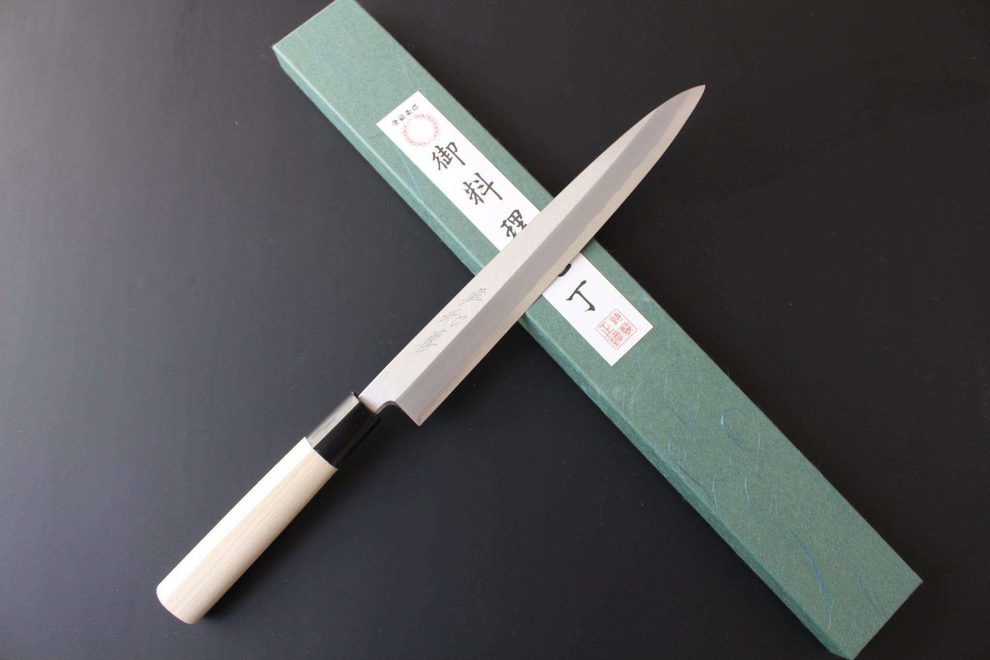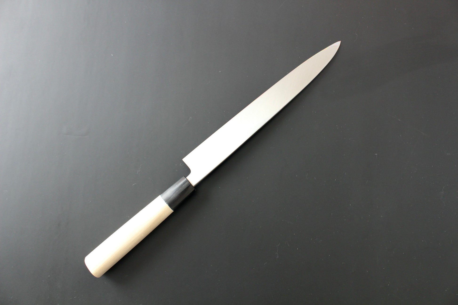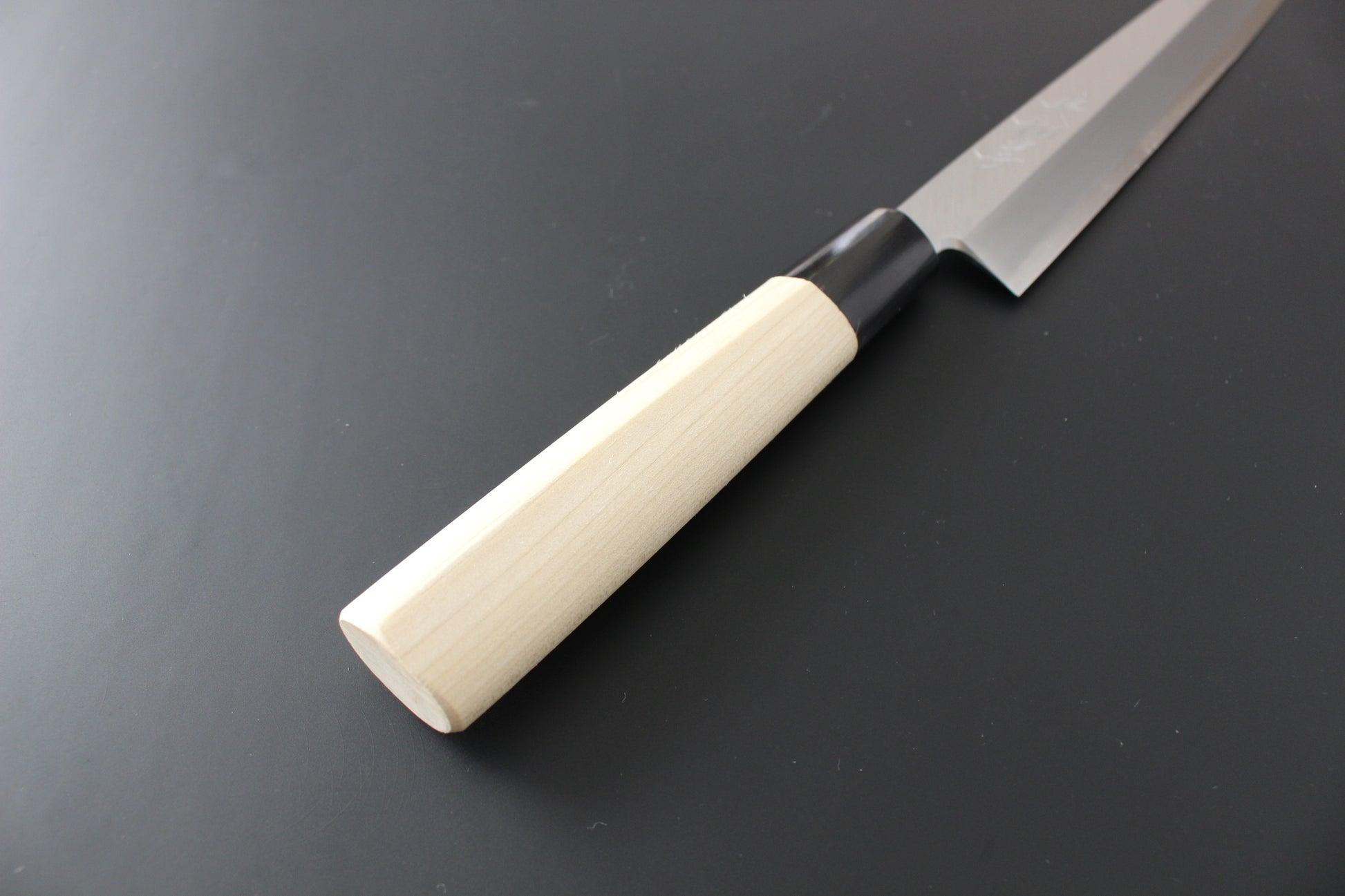 Yanagiba or Sashimi Knife has long and narrow blade which is suitable for slicing tasks especially for fresh raw fish. The shape of a Yanagiba is similar to a Willow leaf (Yanagiba) that is why it is so called. Yanagiba is the most common Japanese knives in Japanese restaurants for slicing fish. Generally blade length between 240mm and 270mm are very popular. Since it has single bevel, there are different shapes for right hander and left hander.
