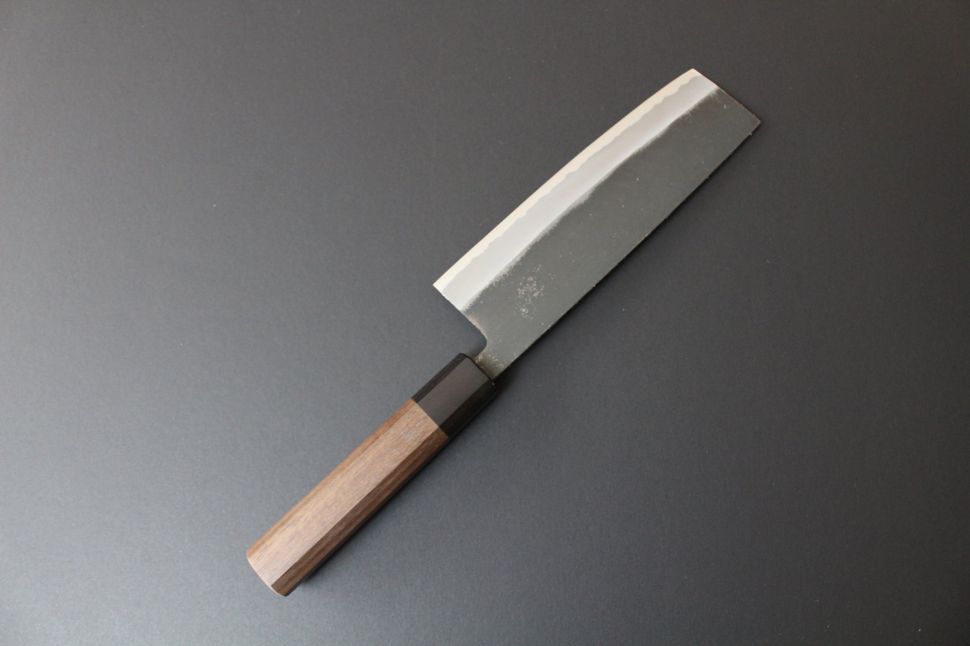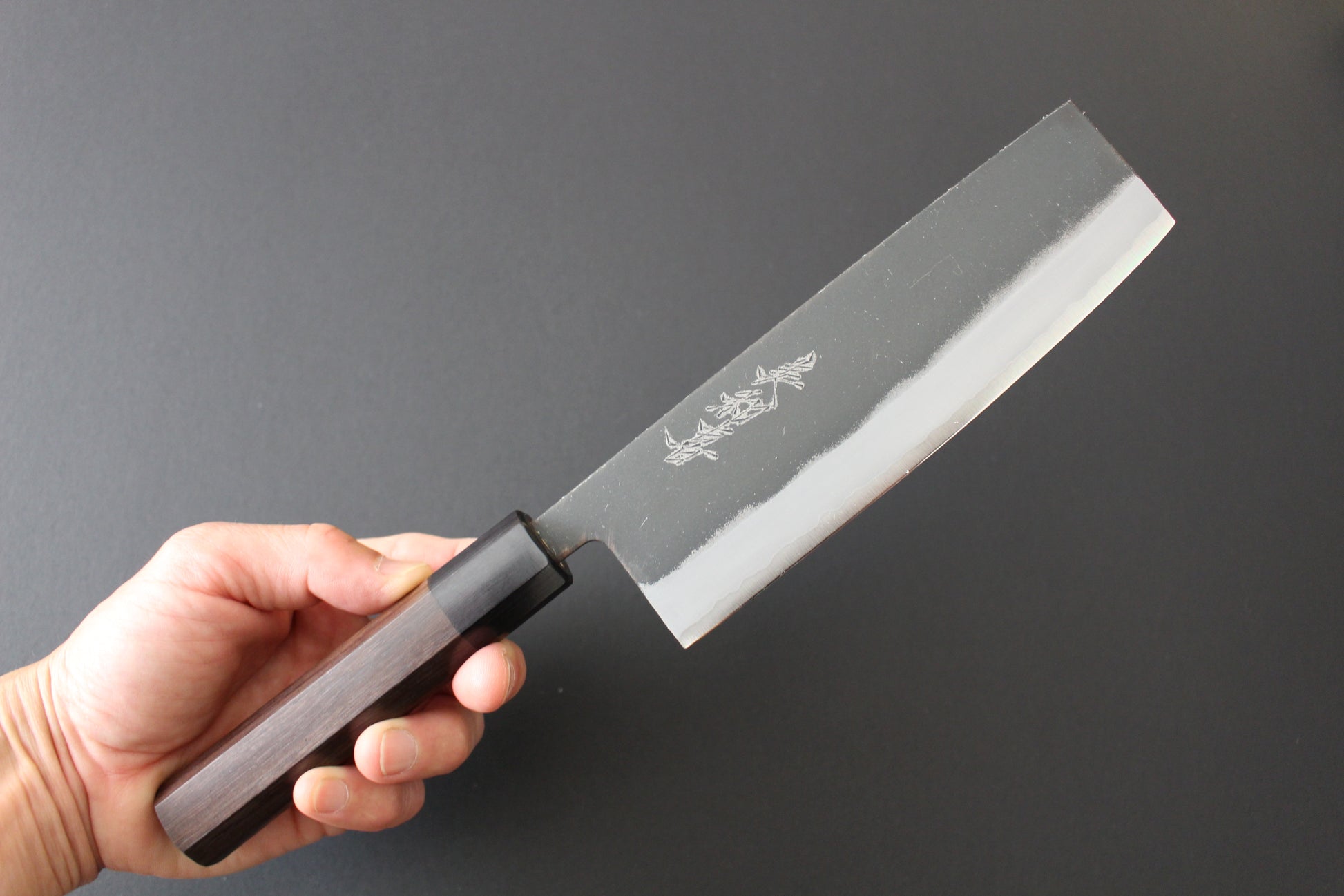Nakiri knife means "cutting vegetables" in Japanese and is is well designed for this purpose. Nakiri has a very thin & almost straight blade which can cut foods evenly from heel to tip so it is easy to chop vegetables. Before Santoku knives become popular, Nakiri was generally used as a common kitchen knife for home cooks in Japan.