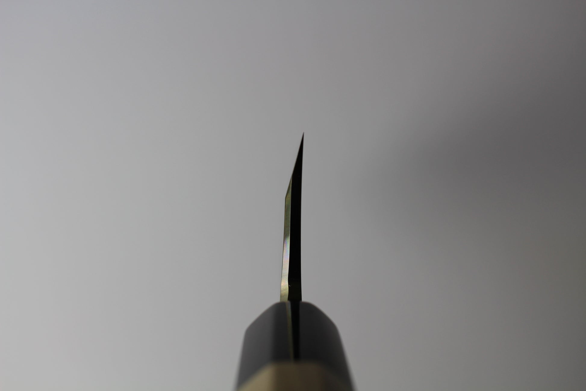 White Steel No.2 is a high carbon steel developed by Hitachi Special Stainless Steel. This steel is standard and most commonly used for Japanese style knives such as Sashimi and Deba knife for long time. White Steel No.2 gives a very sharp edge and has very good edge retention. It is also very easy to re-sharpen. It will rust if it is left wet or left in contact with something containing any amount of moisture, so need to wipe and dry completely after using. For longer storage protect with a film of oil to avoid lasting. Recommended for first time of Japanese style high carbon steel knife users.