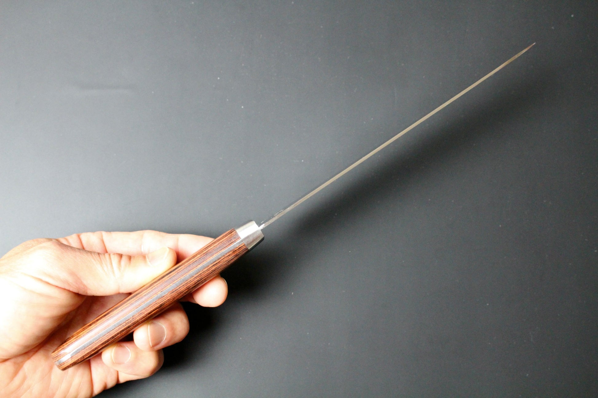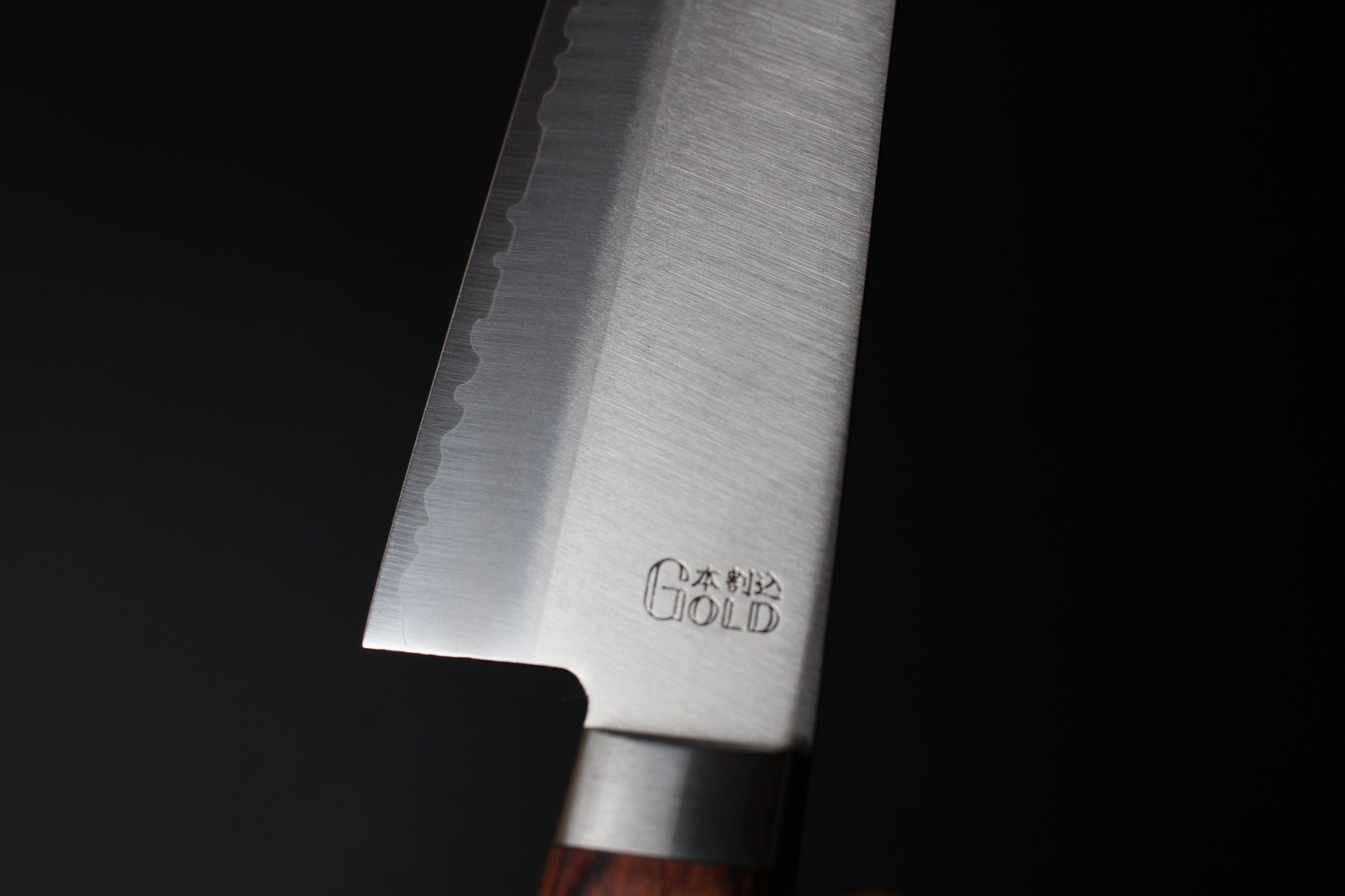 Gyuto Chef knife is the ultimate all-purpose knife for use in your home and commercial kitchens. It can be used for cutting, chopping, slicing, dicing, filleting meat, vegetables and fish. Gyuto knife does pretty much most of the jobs in a kitchen by itself. Gyuto can range from 180mm to 270mm usually. The most popular for home use is 180mm or 210mm as this gives the best balance of length and weight for small spaces and 240mm is more common in commercial kitchens.