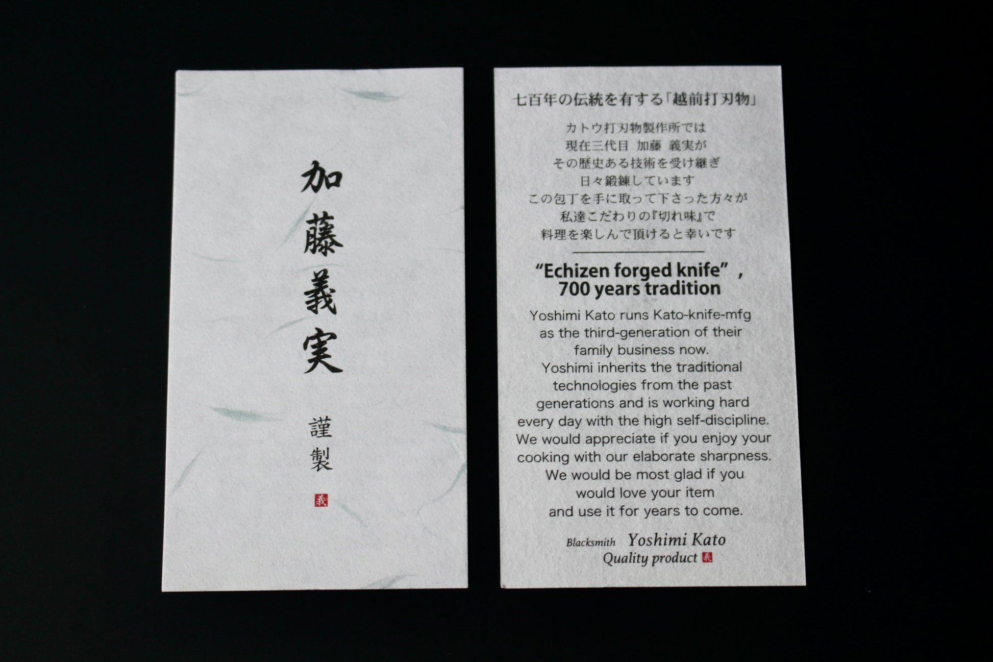 The knives made in Echizen city are called Echizen Uchi Hamono. The art of making Japanese kitchen knives has a history of about 700 years. Blacksmith Yoshimi Kato runs Kato knife mfg as the third generation of their family business in Echizen. All processes of kitchen knife production are carried out in his own workshop by an in-house worker to achieve a fine and careful finish. He is widely known overseas as the “Master of Damascus”. He makes various types of kitchen knives and his knives always have a good reputation for their excellent total balance and beautiful finish.