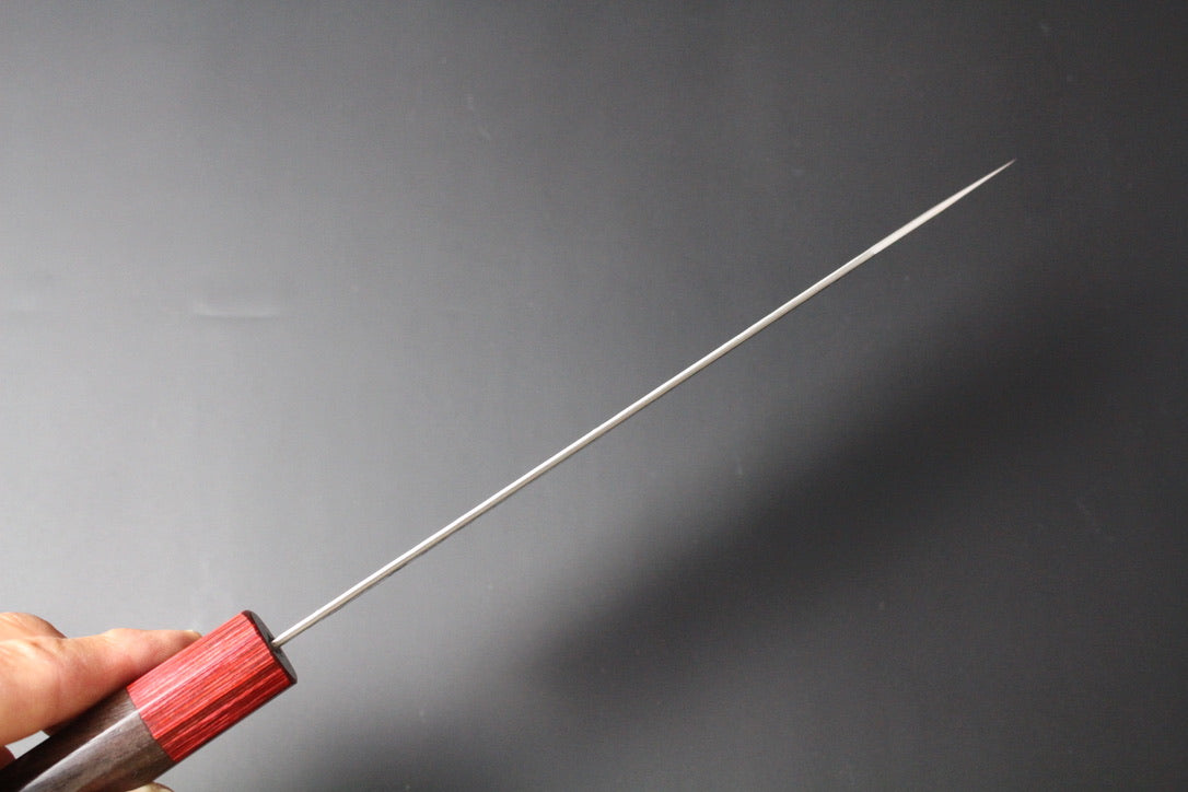 Gyuto Chef knife is the ultimate all-purpose knife for use in your home and commercial kitchens. It can be used for cutting, chopping, slicing, dicing, filleting meat, vegetables and fish. Gyuto knife does pretty much most of the jobs in a kitchen by itself. Gyuto can range from 180mm to 270mm usually. The most popular for home use is 180mm or 210mm as this gives the best balance of length and weight for small spaces and 240mm is more common in commercial kitchens.